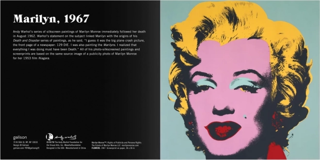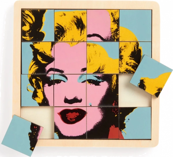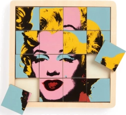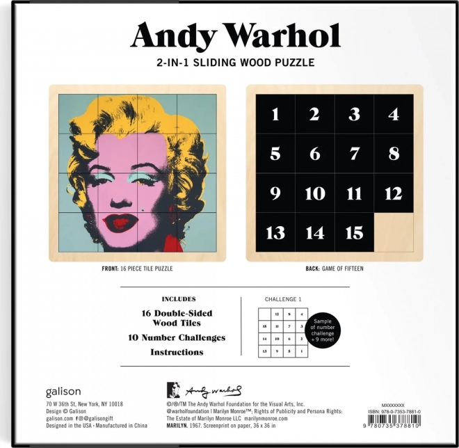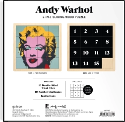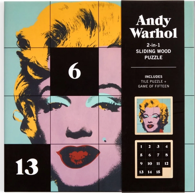 Ce puzzle coulissant en bois unique offre des heures d’amusement et de défi créatif. D’un côté, vous trouverez le motif iconique d’Andy Warhol, et de l’autre un casse-tête numérique : le jeu de quinze. Le puzzle d’environ 15 x 15 cm est conçu pour exiger concentration et stratégie.