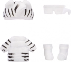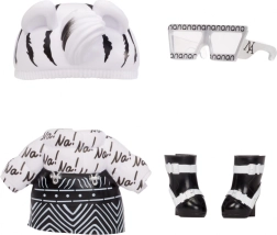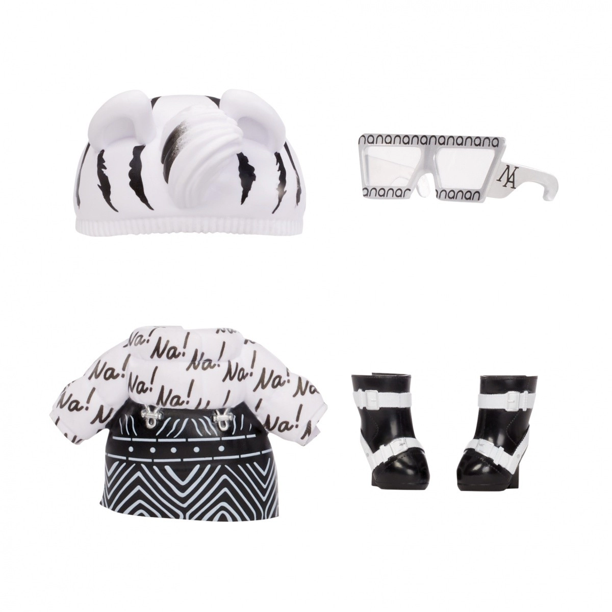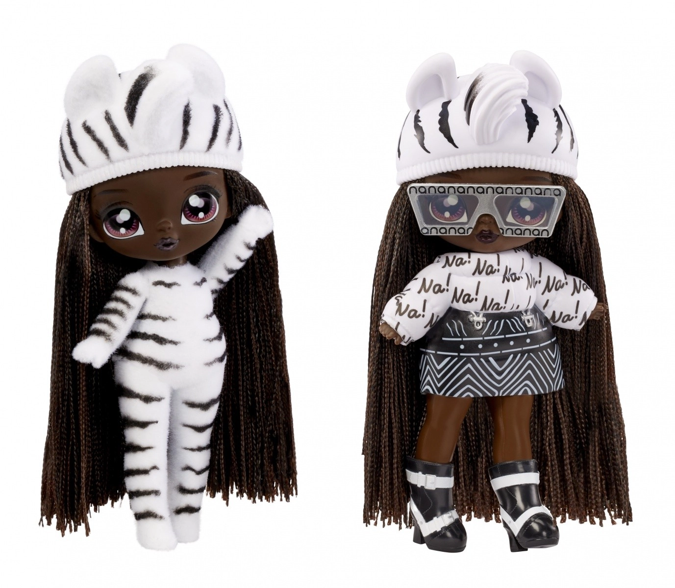 Zebra Girl arrive avec un look animalier noir et blanc comprenant une jupe, un top « Na! », un bonnet à oreilles, des lunettes de soleil et des chaussures – idéal pour jouer à la mode.