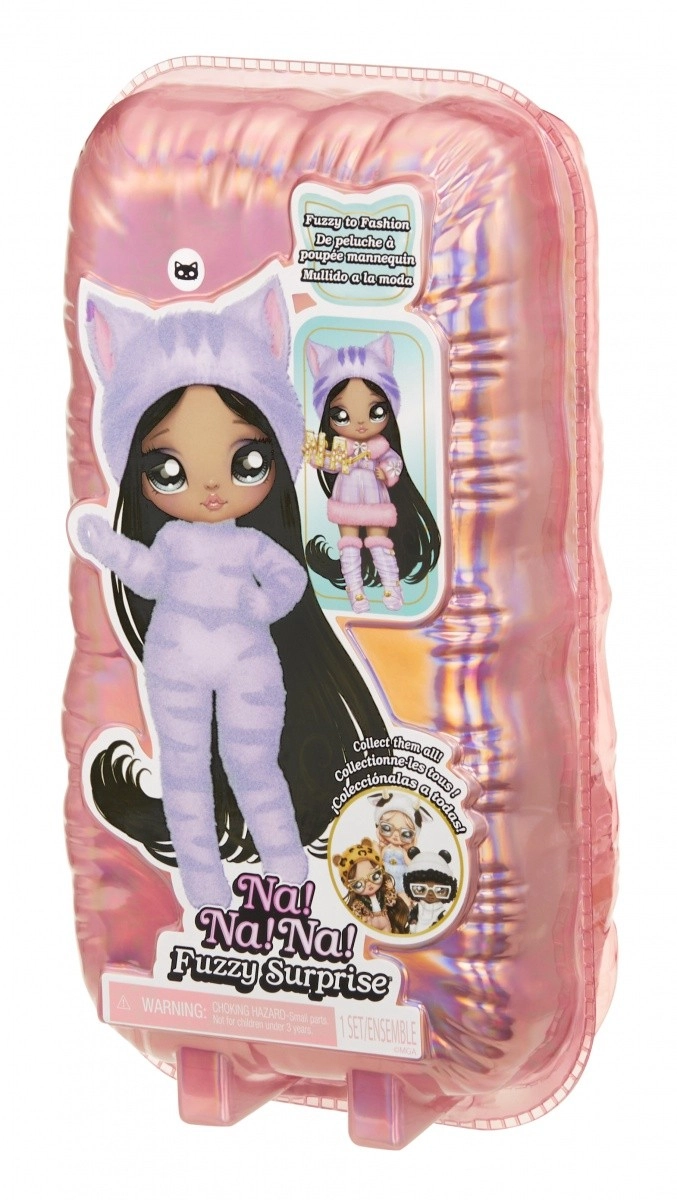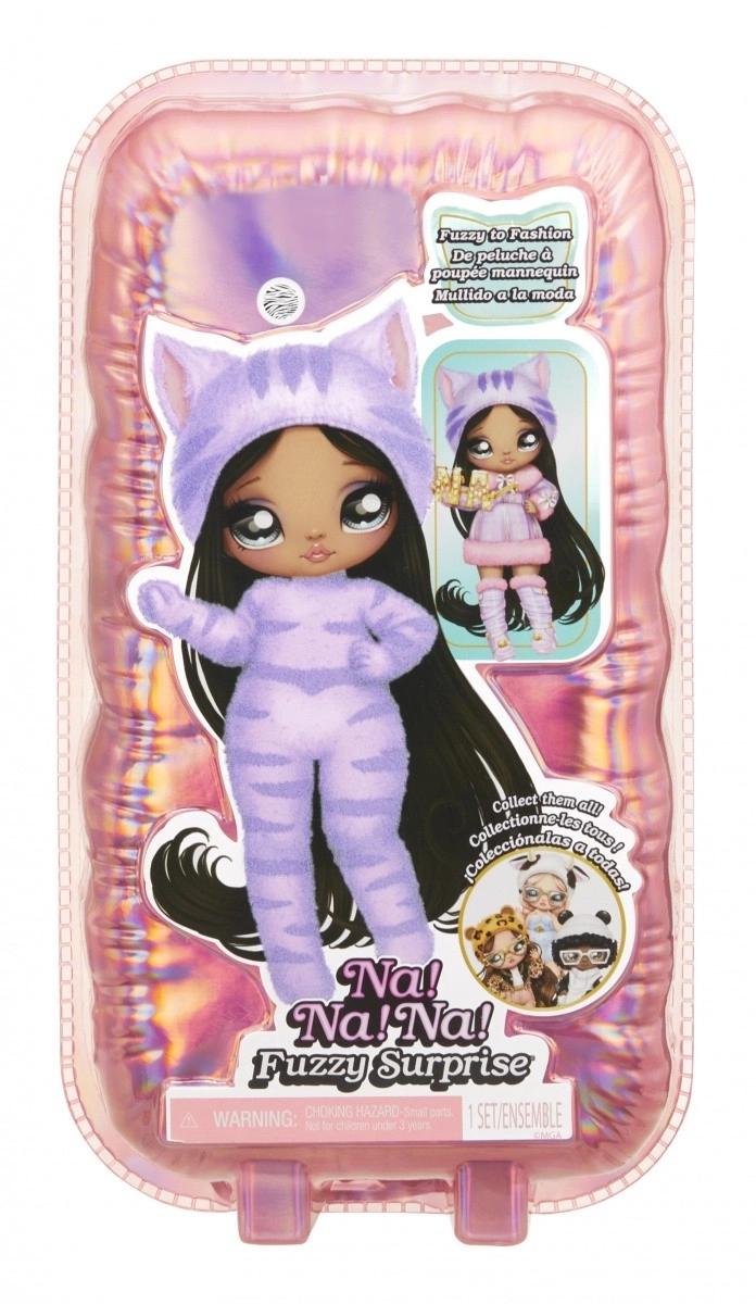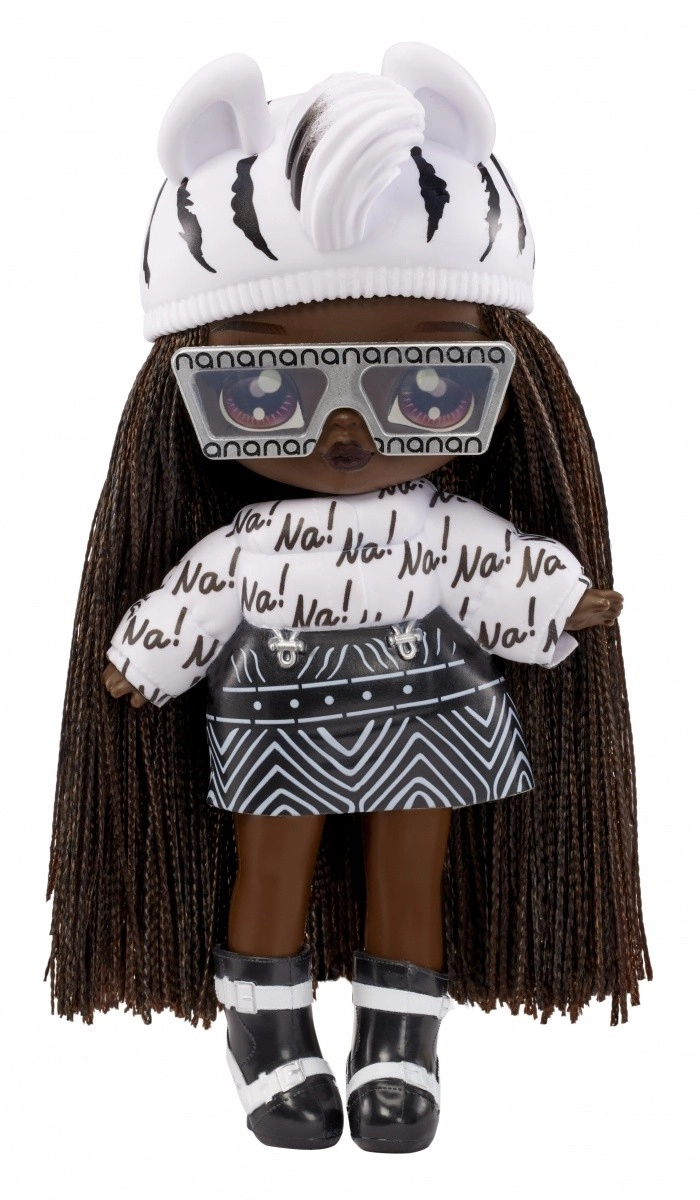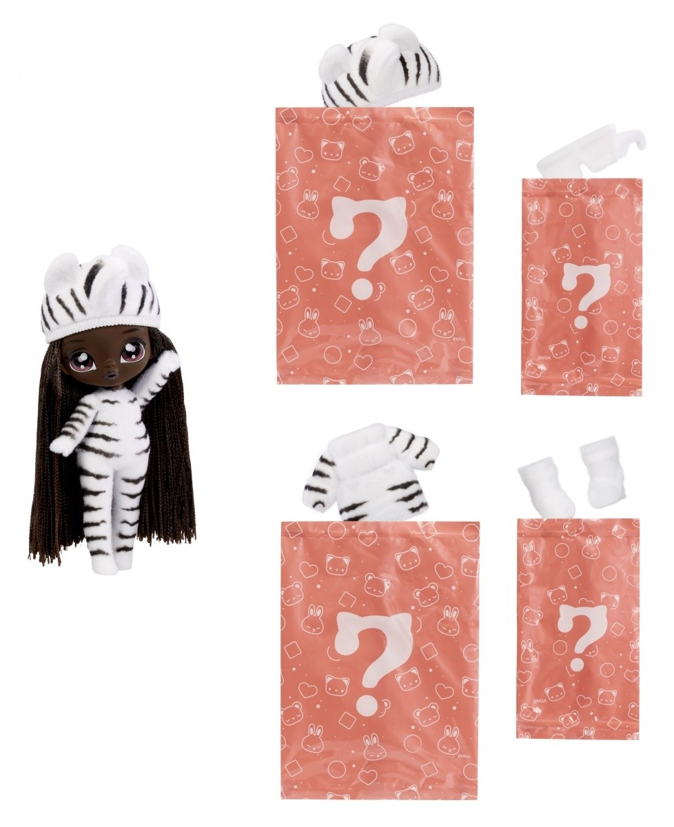 Vivez une nouvelle expérience de révélation avec la collection NA! NA! NA! Fuzzy Surprise. Chaque poupée de 17 cm possède un corps floqué et doux qu’il suffit d’essuyer avec un chiffon humide pour dévoiler son look unique, ses impressions faciales marquées et ses accessoires de mode. Zebra Girl séduit par son style animalier noir et blanc, son bonnet amovible à oreilles et ses lunettes audacieuses.