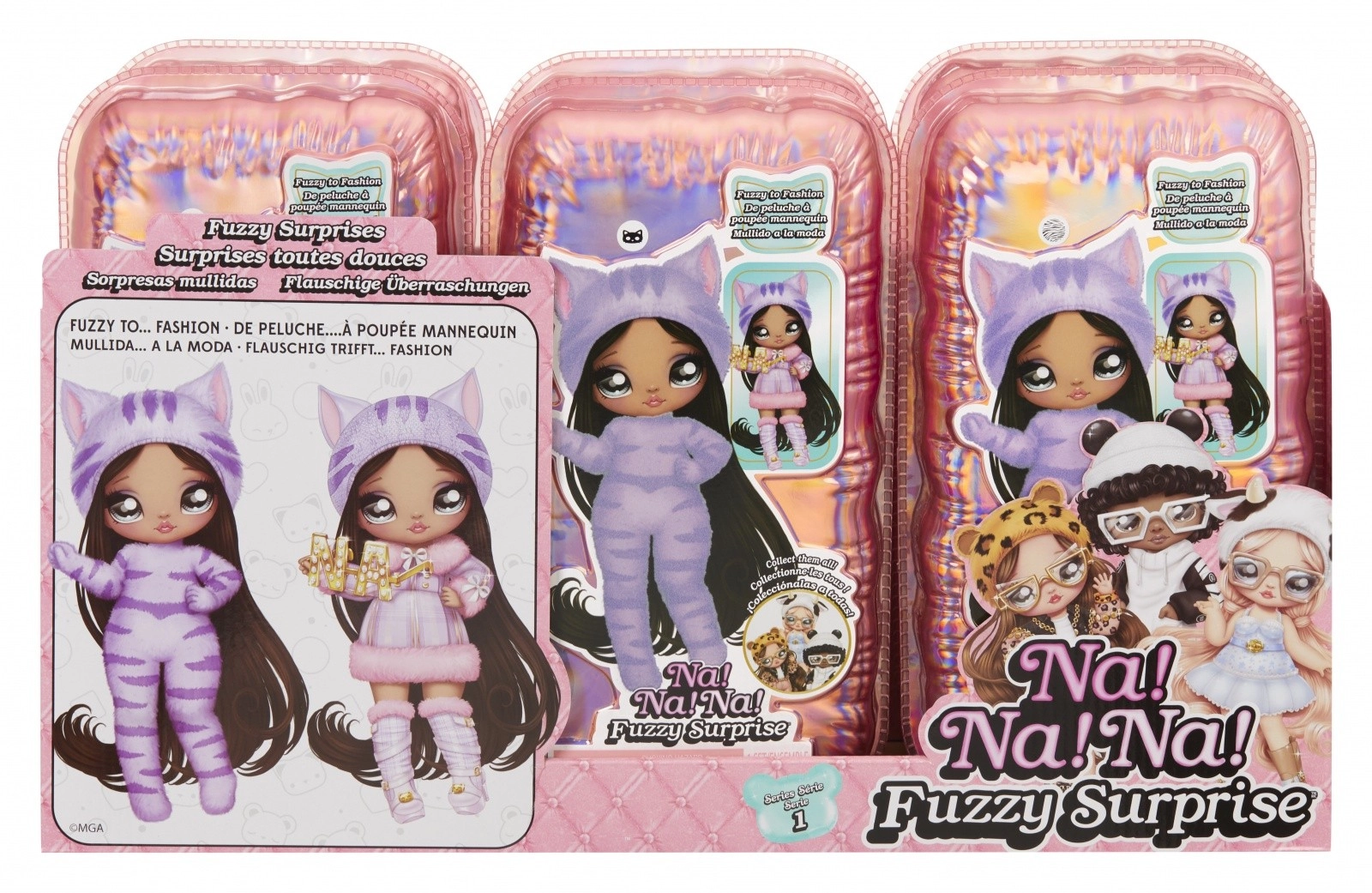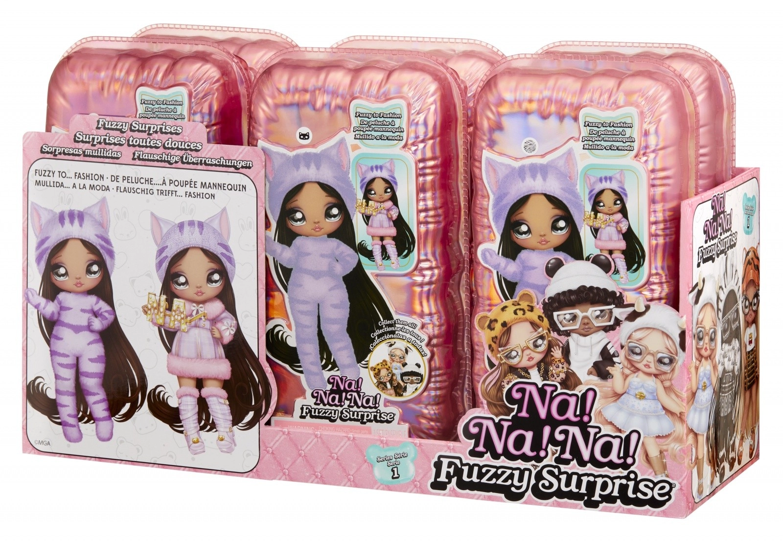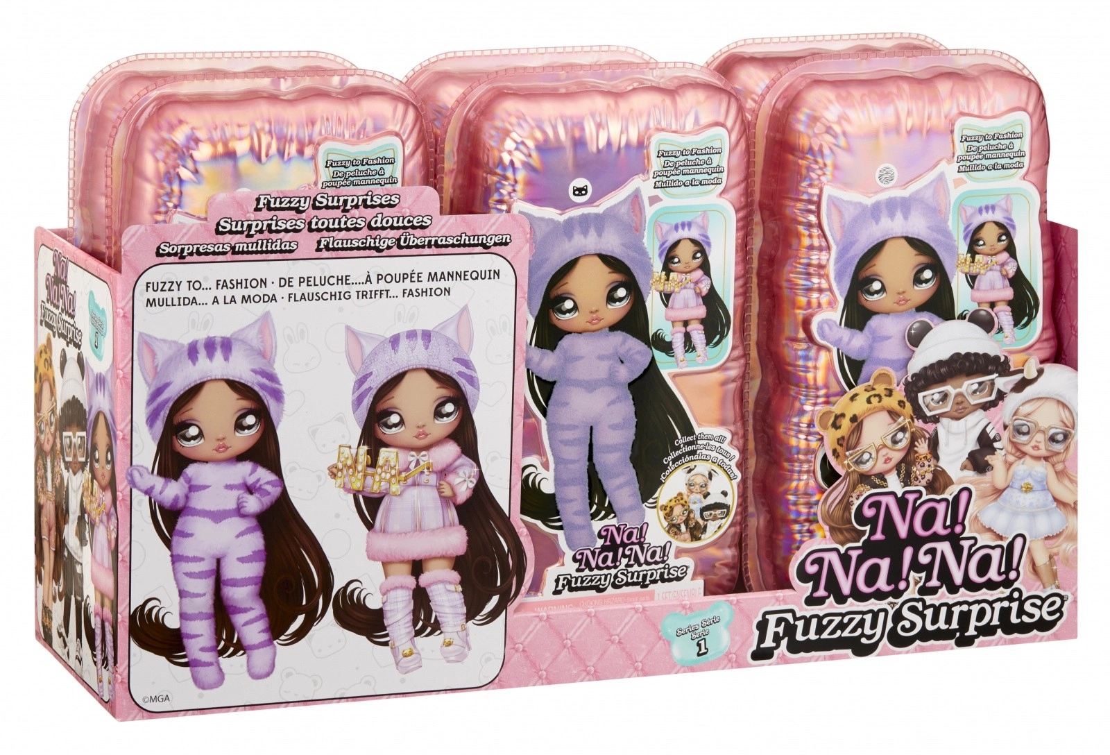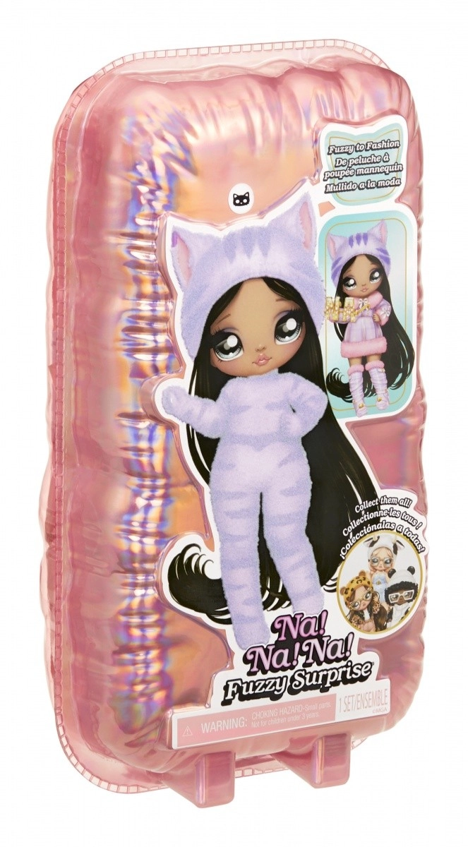 Vivez une nouvelle expérience de révélation avec la collection NA! NA! NA! Fuzzy Surprise. Chaque poupée de 17 cm possède un corps floqué et doux qu’il suffit d’essuyer avec un chiffon humide pour dévoiler son look unique, ses impressions faciales marquées et ses accessoires de mode. Zebra Girl séduit par son style animalier noir et blanc, son bonnet amovible à oreilles et ses lunettes audacieuses.