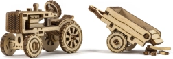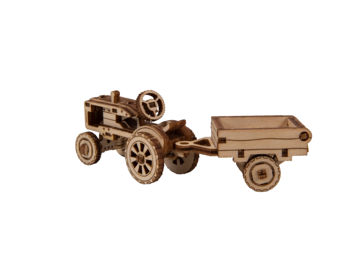 Le modèle de tracteur avec remorque possède des roues mobiles et de riches gravures. La remorque peut être inclinée – idéal comme décoration en bois impressionnante.