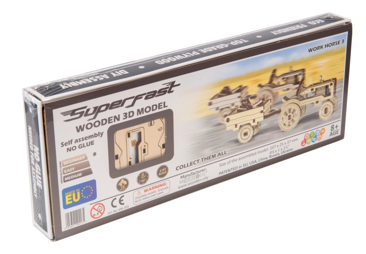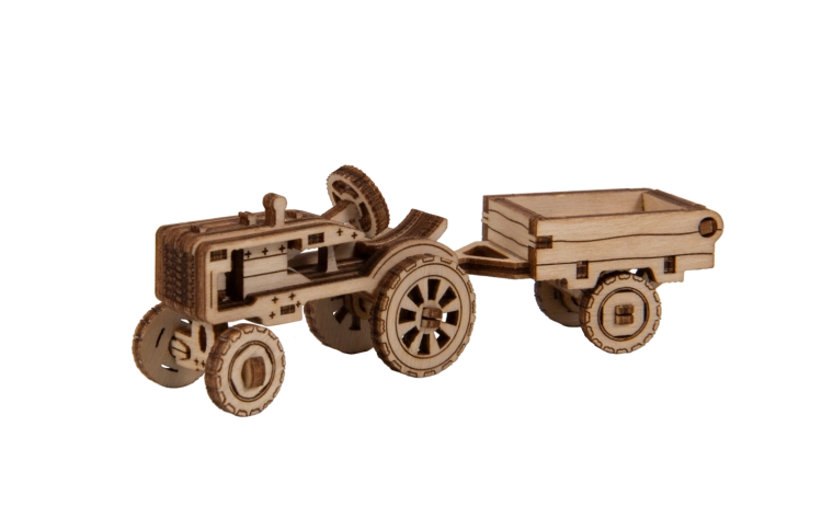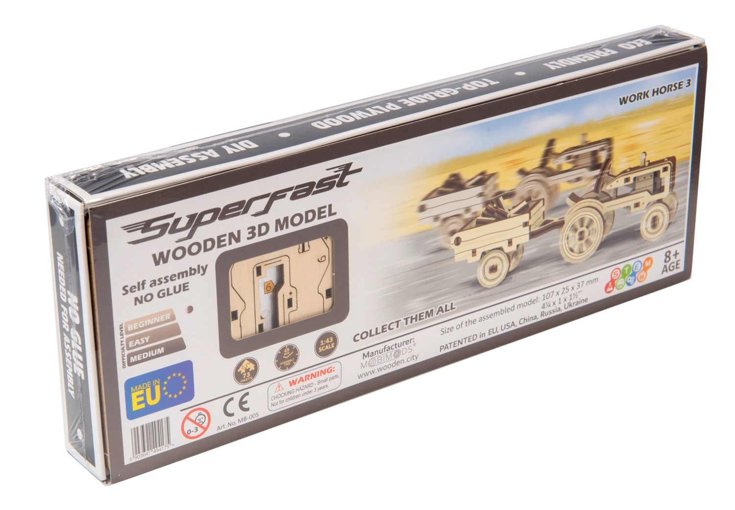 Ce modèle minutieusement réalisé « Work Horse 3 » s’inspire des célèbres tracteurs américains et offre un mélange attractif de créativité et de détente. Les pièces sont prédécoupées au laser, vous n’avez donc pas besoin de colle ni de vis – tout s’assemble proprement pour aboutir à un tracteur réaliste avec une remorque basculante.