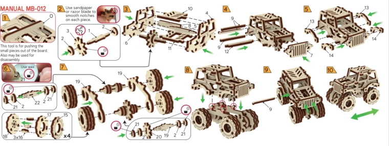 Le modèle est fabriqué en contreplaqué de qualité, se monte sans colle ni outils et convient aussi aux débutants. Pour un mouvement mécanique fluide, il suffit de lubrifier légèrement les engrenages et axes avec de la cire (par ex. une bougie), ce qui réduit les frottements et augmente la durabilité.
