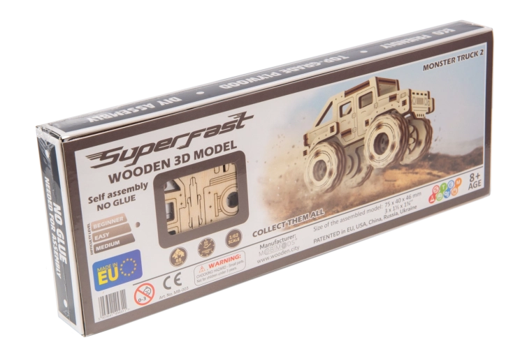 Fabriqué à partir de matériaux écoresponsables, il respecte la durabilité – sans emballages plastiques. Vous pouvez en plus le peindre selon votre imagination pour l’harmoniser avec votre intérieur ou votre collection. Parfait pour les fans de monster trucks, les enfants dès 8 ans et les modélistes adultes.