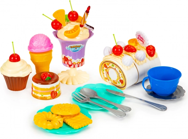 En plus du gâteau, vous trouverez dans le set d'autres sucreries colorées, telles que des cornets de glace, des croissants et des cupcakes, qui renforcent la crédibilité et enrichissent le jeu. Les enfants peuvent développer leur imagination et leur motricité fine en arrangeant et en servant ces délices.