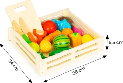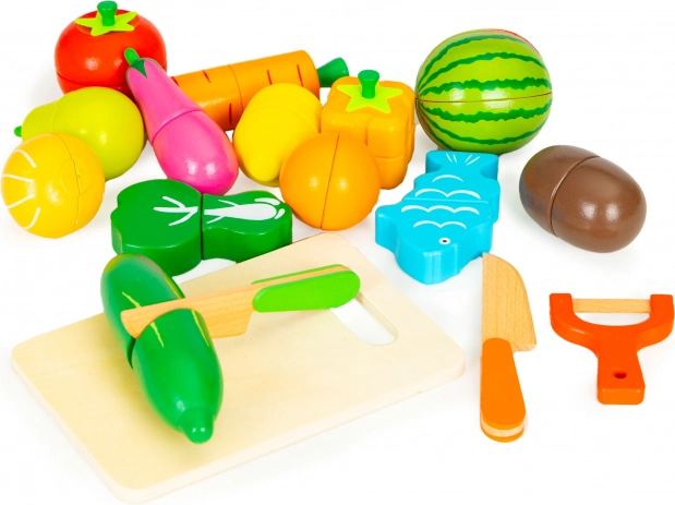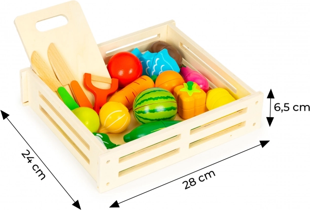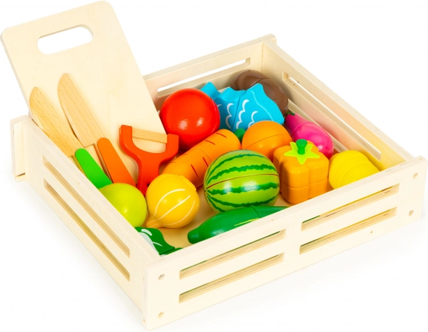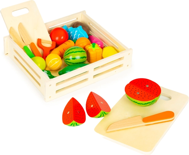 Grâce aux jonctions magnétiques, chaque morceau peut être « coupé » en toute sécurité avec le couteau en bois puis réassemblé. Le jeu développe ainsi la motricité fine, la coordination œil–main et l'apprentissage par imitation. La boîte en bois pratique facilite le rangement de toutes les pièces.