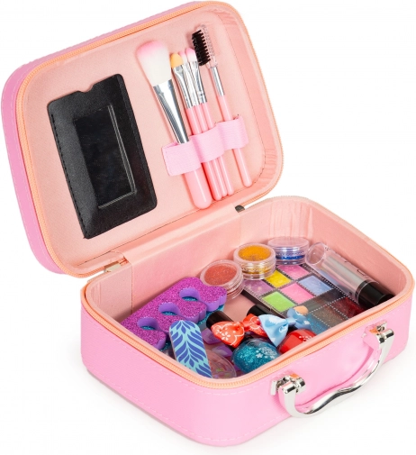 Découvrez un monde magique de beauté pour enfants dans une valisette portable avec poignée solide et miroir. Tous les composants sont conçus pour être doux pour la peau des enfants et se nettoient facilement à l’eau ou avec une lingette humide. Grâce à des compartiments astucieux, tout reste à sa place même en voyage.