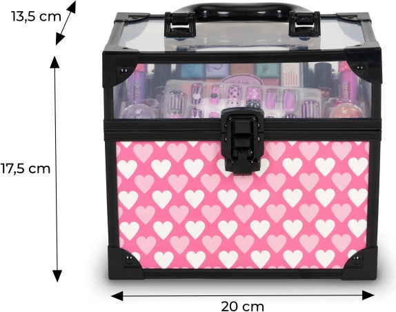 La trousse avec couvercle transparent garde tout bien ordonné et, grâce à ses dimensions compactes, se transporte facilement. Le coffret comprend des gloss pour les lèvres, des vernis à ongles, des rouges à lèvres, une palette de fards à paupières gel, des bagues et un kit d’ongles autocollants – l’équipement parfait pour un maquillage créatif et le développement de l’imagination.