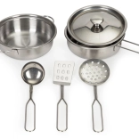 Le set contient deux casseroles, un couvercle, une louche, une spatule et une cuillère perforée en métal. Tous les outils sont conçus pour être sûrs à utiliser par les enfants.