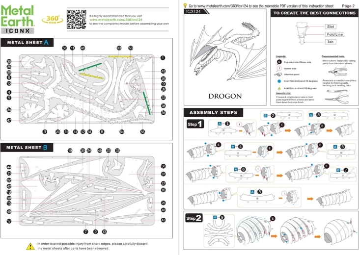 Défi palpitant, plaisir d’assemblage et résultat éblouissant – voilà les modèles METAL EARTH ! Le modèle de la gamme premium ICONX Game of Thrones vous séduira par une finition des détails encore plus aboutie ! Construire le puzzle 3D METAL EARTH ICONX demande de la patience et de l’adresse. Le résultat compense pleinement les efforts fournis ! Ces répliques miniatures sont une décoration particulièrement impressionnante et captivante, non seulement à la maison, mais aussi au bureau ou à l’école. À partir de plaques rectangulaires d’acier (21 x 11 cm) contenant des pièces de monuments mondiaux, de célèbres moyens de transport, d’instruments de musique ou d’animaux, vous ferez naître sous vos doigts des modèles fascinants, richement détaillés. L’aspect authentique des puzzles 3D METAL EARTH ICONX est obtenu grâce à une gravure laser précise et détaillée. L’emballage contient 2 plaques d’acier et une notice de montage. Les outils ne sont pas inclus. PROCÉDURE DE TRAVAIL : Retirez les pièces des plaques métalliques, en utilisant si nécessaire de petites pinces coupantes (non incluses). Les pièces s’assemblent à l’aide de verrous composés d’un ergot et d’un trou. Pliez l’ergot à l’aide de petites pinces fines (non incluses) et assemblez progressivement tous les verrous jusqu’à obtenir une pièce maîtresse très réaliste ! Âge recommandé : à partir de 14 ans. Dimensions du puzzle assemblé : environ 21 x 19 x 4 cm