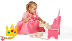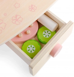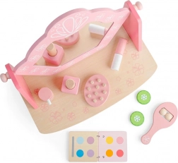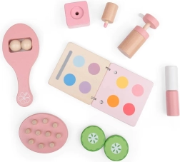 Elle est accompagnée d’un riche ensemble d’accessoires en bois pour un jeu réaliste : palette compacte, « rondelles de concombre », rouleau de massage, brosse à cheveux, rouge à lèvres, parfum et vernis à ongles. En jouant, les enfants développent leurs compétences sociales, leur imagination et la coordination œil-main.