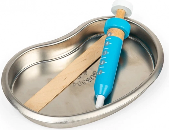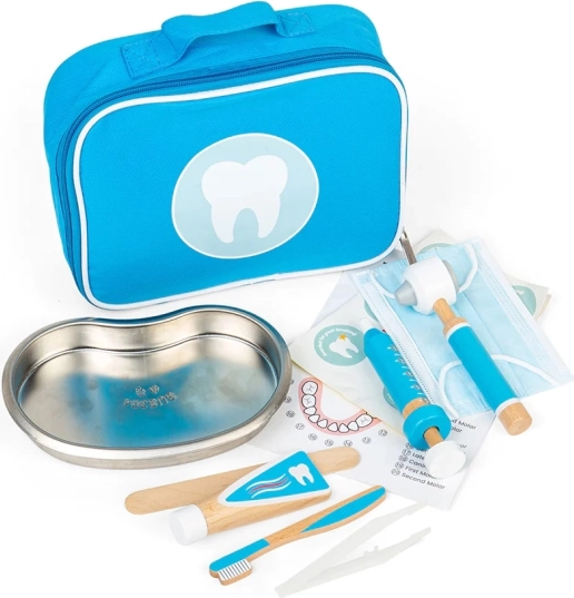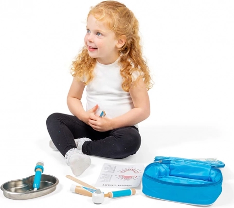 La mallette bleue élégante contient tout ce dont un petit dentiste a besoin : une brosse à dents en bois, un tube de dentifrice, une seringue, un otoscope, une pince, un masque, un plateau en acier inoxydable, un autocollant et un guide pour un brossage correct. Les enfants peuvent ainsi découvrir en toute sécurité ce qui les attend chez le dentiste et développer naturellement un rapport positif à l’hygiène bucco-dentaire.