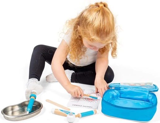 Le jeu de rôle du dentiste encourage la communication, l’empathie et la coopération avec les amis. Les pièces sont adaptées aux petites mains et fabriquées à partir de matériaux de qualité issus de sources responsables, conformes aux normes de sécurité européennes. La mallette facilite le rangement et le transport de l’ensemble.