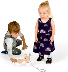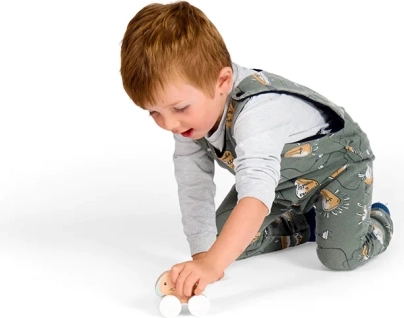 Les quatre roues robustes au motif géométrique roulent en douceur sur les surfaces planes, tandis que la corde grise se tient facilement même dans les petites mains. Le jouet aide à développer l’adresse, l’équilibre et les compétences de coordination, tout en stimulant le mouvement actif et l’imagination.