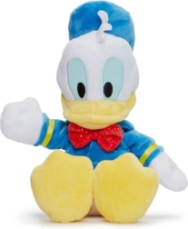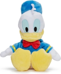 Le canard Donald en peluche, dans sa tenue classique, est le compagnon de jeu idéal pour les plus petits. Il porte habituellement un costume de marin bleu (sweat et béret) avec un nœud papillon rouge. Hauteur : 25 cm.