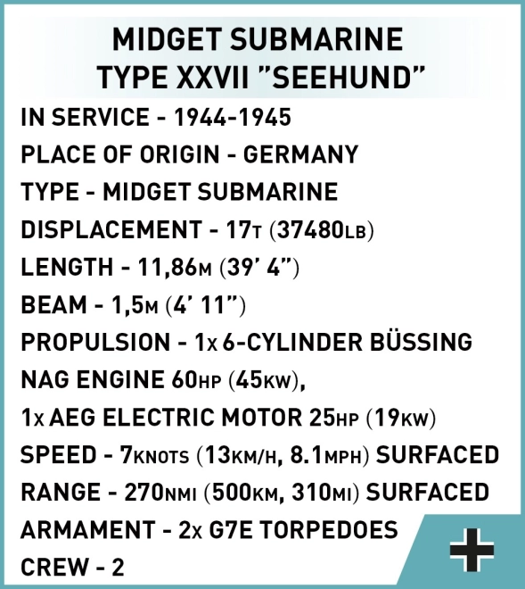 Le Seehund (Type XXVII B) était un mini-sous-marin allemand de 1944, opéré par un équipage de deux personnes et déployé à la fin de la Seconde Guerre mondiale. Cet ensemble de collection sous licence a été créé en collaboration avec le Deutsches Marinemuseum, où l’un des rares exemplaires conservés est exposé. La maquette COBI capture fidèlement les lignes caractéristiques de l’original à l’échelle optimisée 1:72.