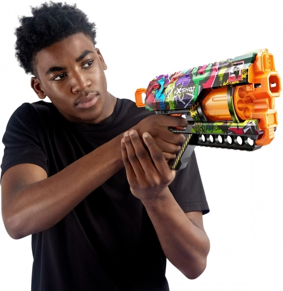 Prépare-toi pour une action trépidante avec le blaster X-SHOT Skins Griefer Graffiti ! Grâce à son barillet rotatif de 6 fléchettes, une portée allant jusqu’à 27–30 m et 12 fléchettes en mousse sûres incluses, profite de combats rapides et précis, en extérieur comme à la maison.
