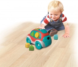 La voiture propose des ouvertures pour différentes formes géométriques. En insérant les pièces, les enfants développent leur motricité fine et apprennent à reconnaître les couleurs et les formes.