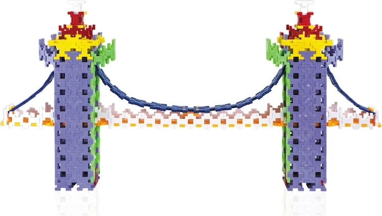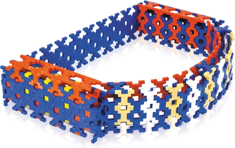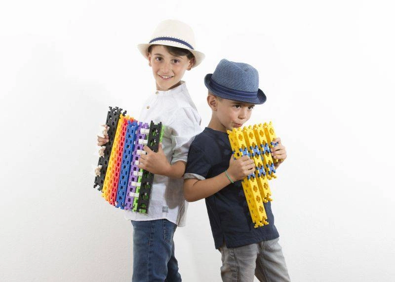 La forme emboîtable en « X » des pièces permet des constructions stables et variées – des motifs plats aux ponts, tours et personnages en volume.
