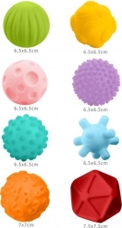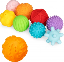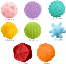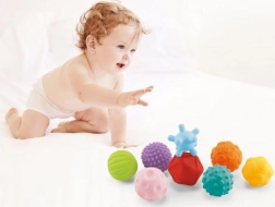 Cet ensemble coloré offre de nombreuses découvertes aux bébés et aux tout-petits — chaque balle présente une surface texturée, une taille et une couleur différentes, ce qui permet aux enfants de développer naturellement la préhension, la coordination œil–main et la perception des formes. Le silicone souple est agréable au toucher et les balles se pressent facilement avec de petites mains.
