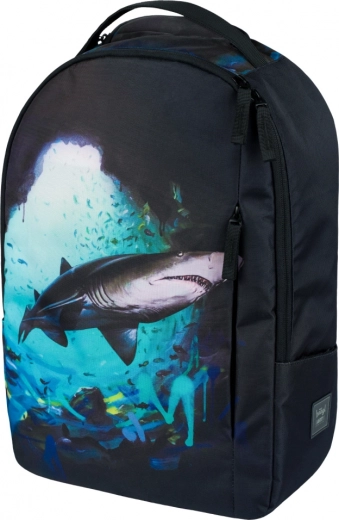 Sac à dos urbain stylé en matière imperméable 100 % recyclée avec motif de requin par LUKERO. Il offre un dos ergonomique, une construction légère (500 g), un volume de 18 l et une poche pour ordinateur portable 15". Idéal pour un usage quotidien à l’école, au travail et pendant les loisirs.