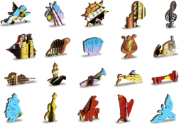Des pièces spéciales en forme d’animaux, de bâtiments et d’objets ajoutent de la difficulté et un effet visuel — certaines peuvent tenir debout comme de petites figurines.