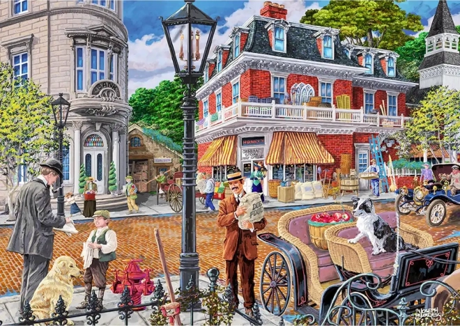 Une illustration vibrante avec maisons d’époque, carrioles et marché animé transforme l’assemblage en une expérience visuelle attrayante pour enfants et adultes.