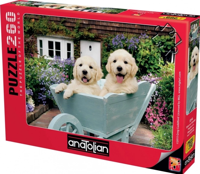Adorable puzzle représentant des chiots dans une charrette, qui ravira tous les amoureux des animaux. Il contient 260 pièces et, une fois assemblé, mesure environ 48 × 33 cm. Finition de qualité pour un emboîtement précis et un assemblage agréable. Le fabricant ANATOLIAN propose en outre un service d’envoi de pièce manquante (sous conditions).