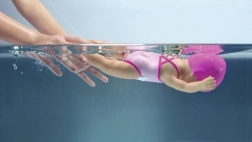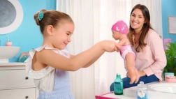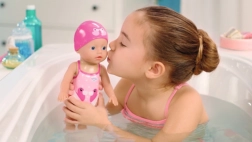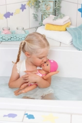 Le corps léger et étanche de la poupée est idéal pour le bain et la petite piscine – l’enfant observe comment la poupée nage et flotte à la surface.