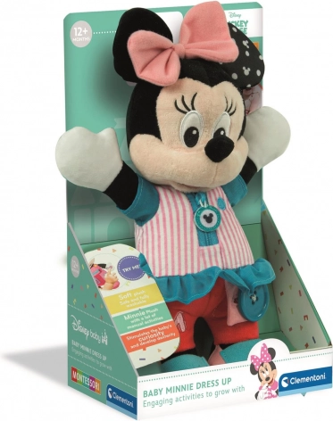 Adorable peluche BABY MINNIE, un jouet d’éveil tout doux inspiré de la méthode Montessori. Grâce à ses matières variées et à des tâches pratiques – comme la fermeture éclair, le bouton et l’habillage – elle favorise la motricité fine, la coordination œil‑main et le jeu autonome. Lavable en machine.