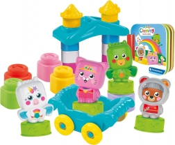 - Carrosse, 12 blocs souples Clemmy, 2 petites tours, toit, 4 blocs avec figurines d’animaux, livre cartonné illustré