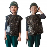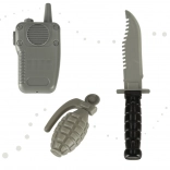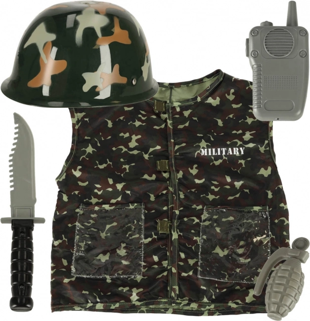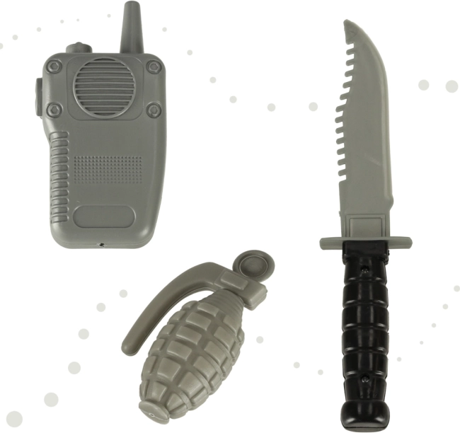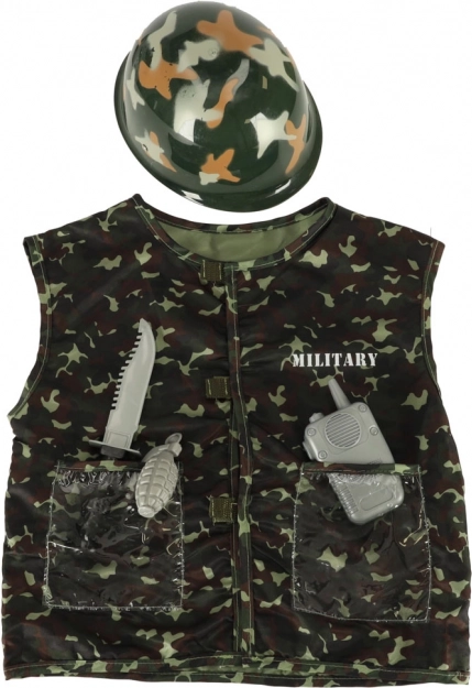 Le costume comprend un gilet de camouflage, un casque, un couteau en plastique, une grenade et une radio à ondes courtes.