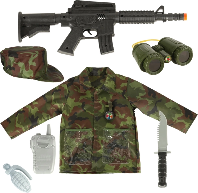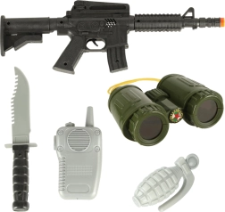 L'ensemble comprend des accessoires en plastique tels qu'une arme, un couteau, un talkie-walkie et d'autres, pour un jeu réaliste et le développement de l'imagination.