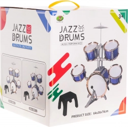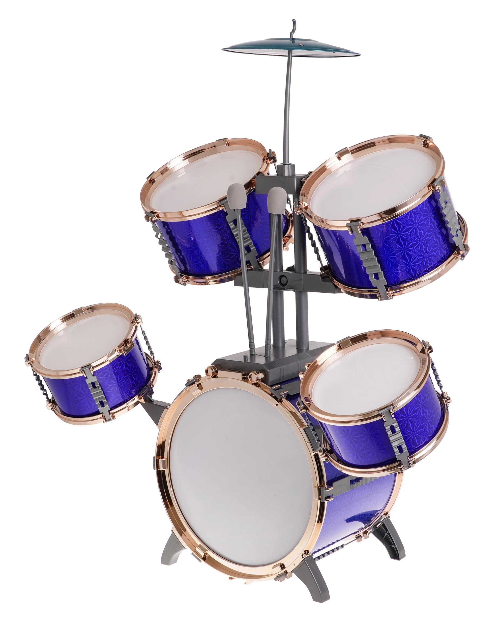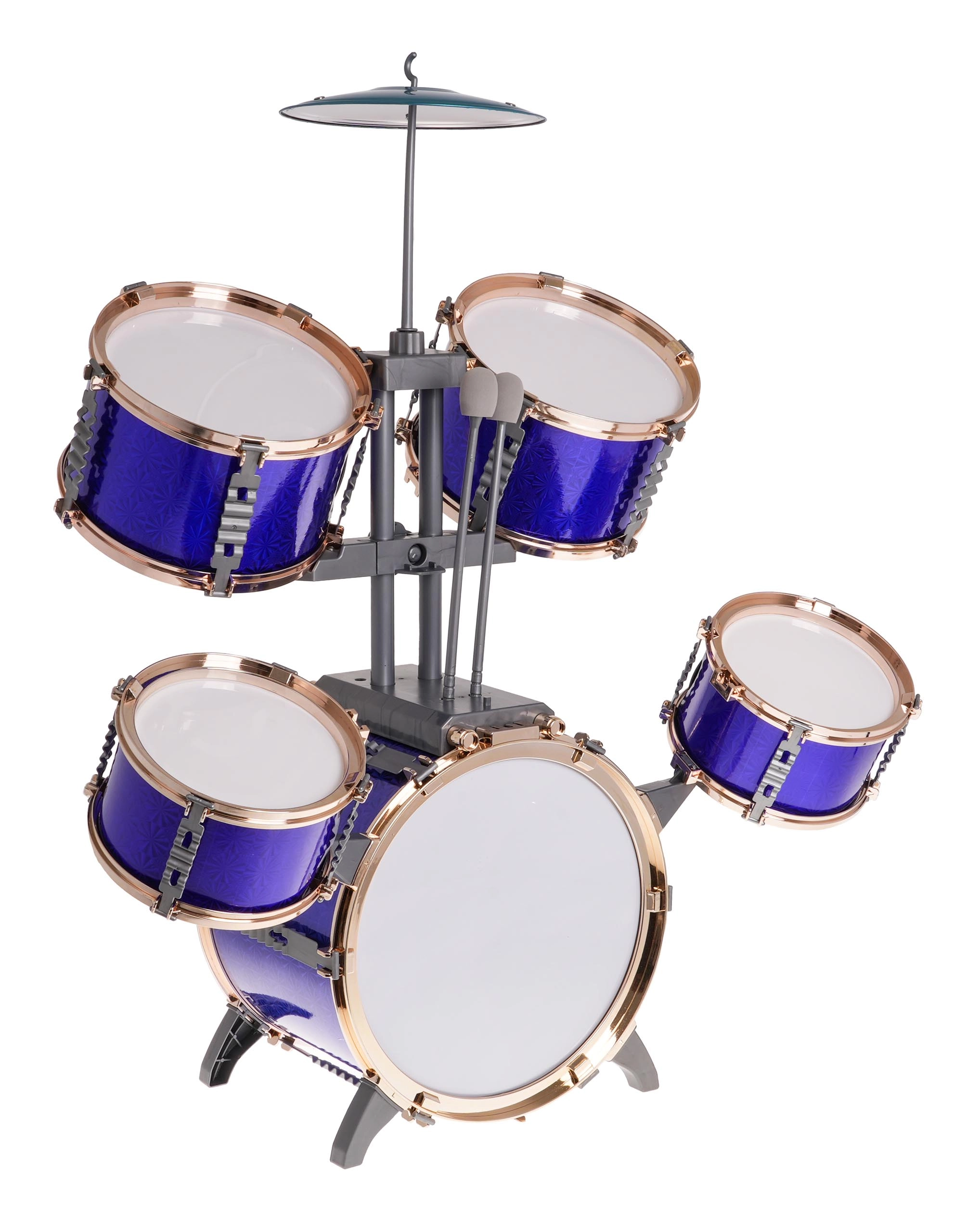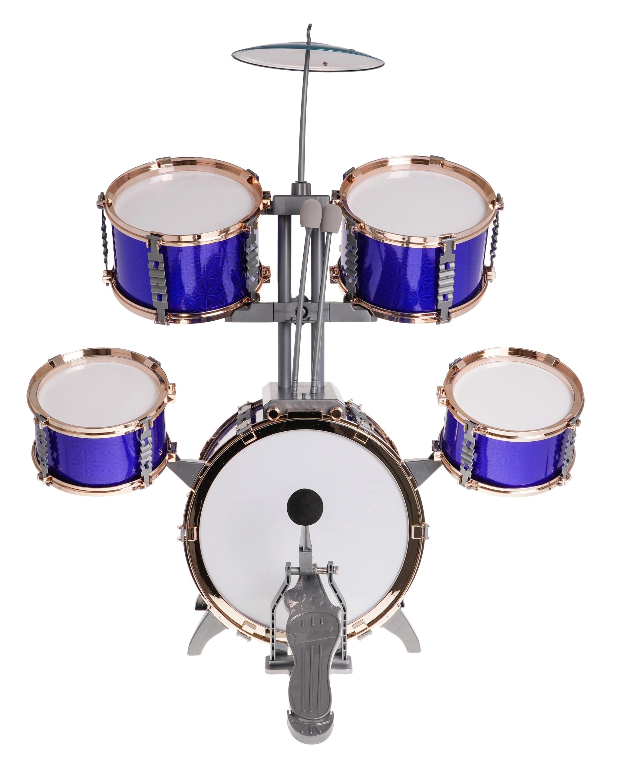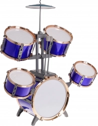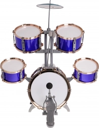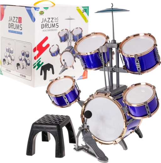 Grande batterie pour enfants de couleur bleue offrant dès 3 ans une entrée ludique dans le monde du rythme. Elle comprend 5 tambours, une cymbale en métal, 2 baguettes et un tabouret. Sa construction stable et ses dimensions adaptées aux enfants favorisent le développement de la coordination, du sens du rythme et du jeu créatif.
