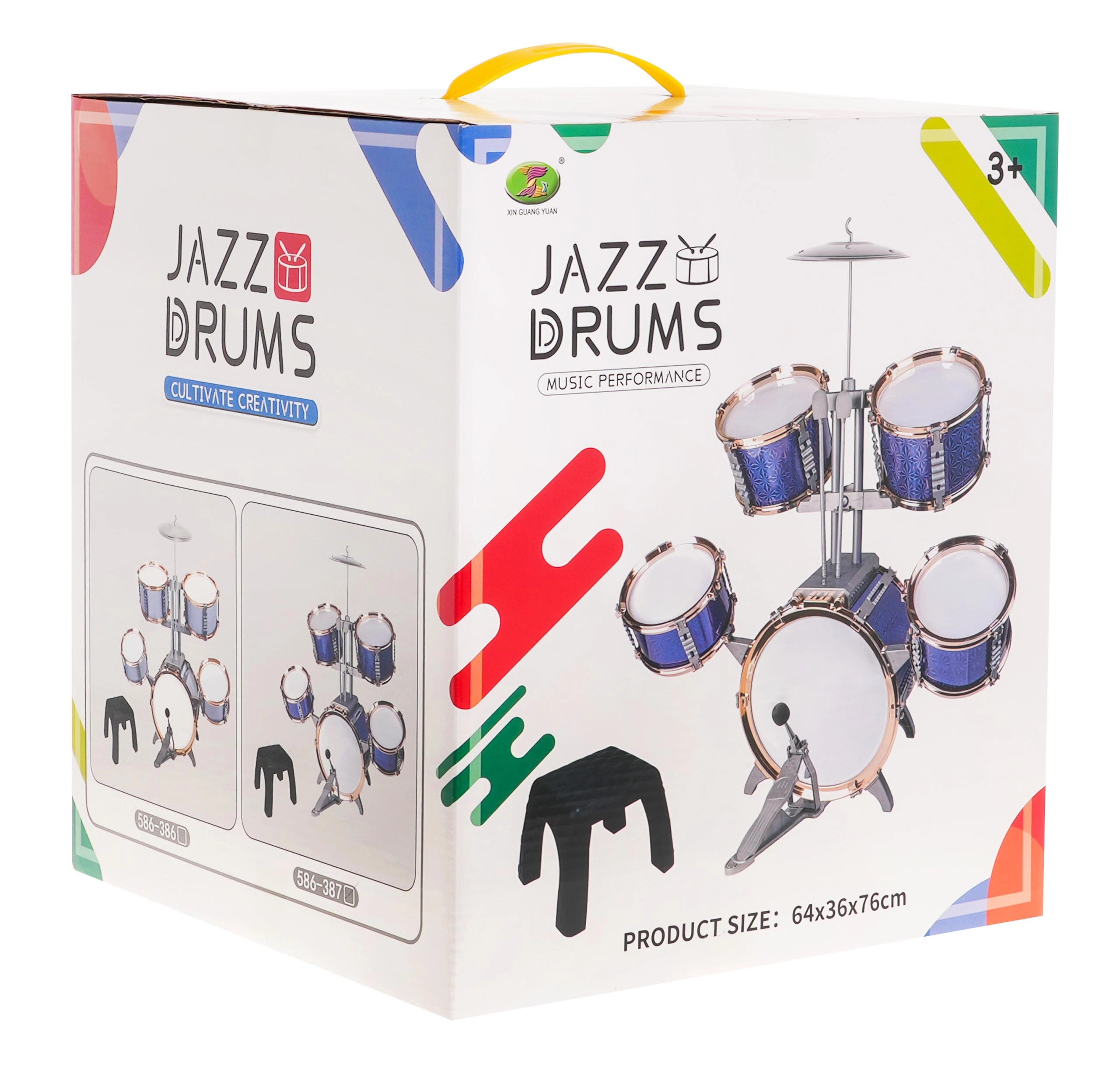 - Set complet : 5 tambours, cymbale en métal, 2 baguettes, tabouret