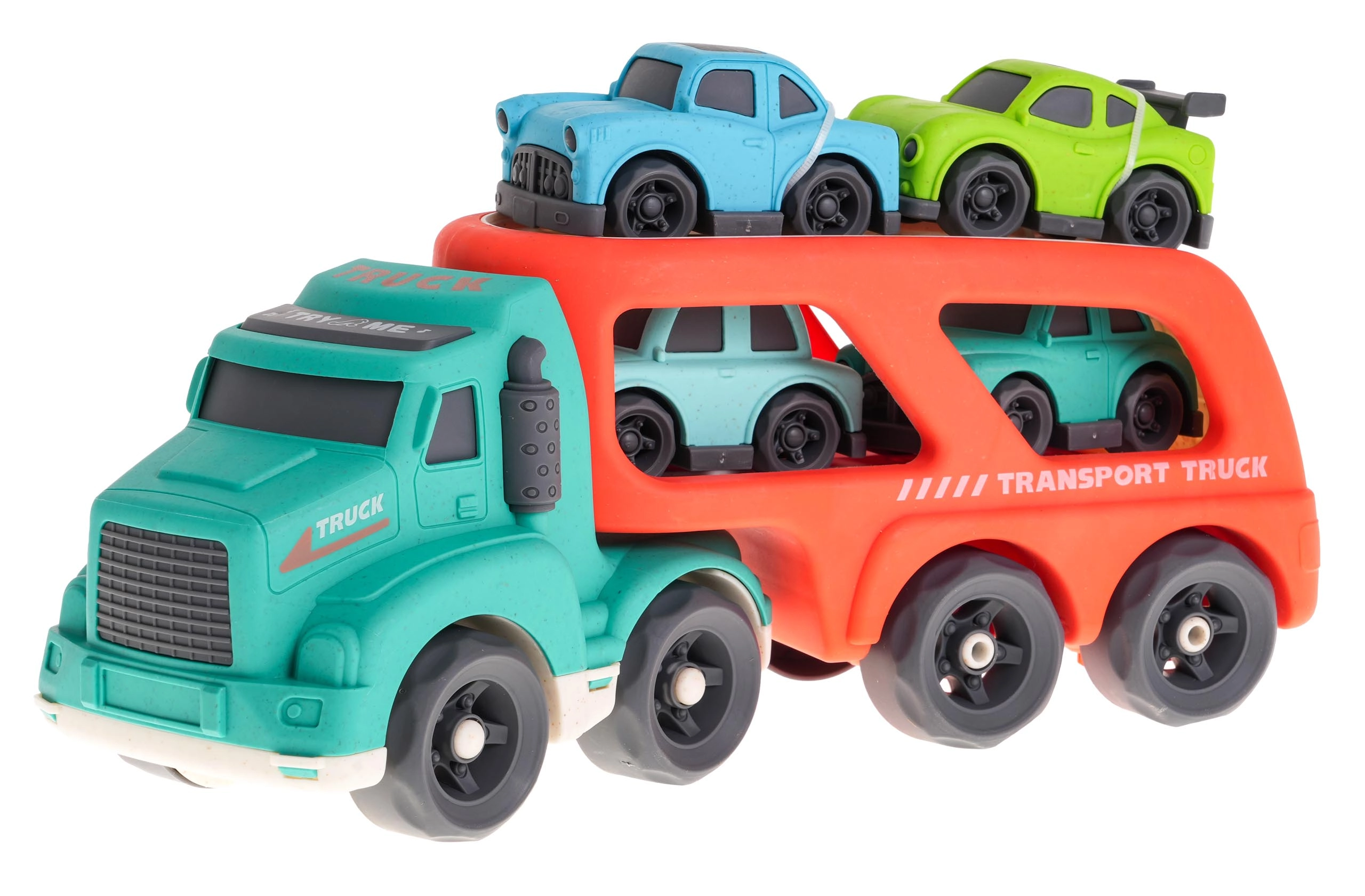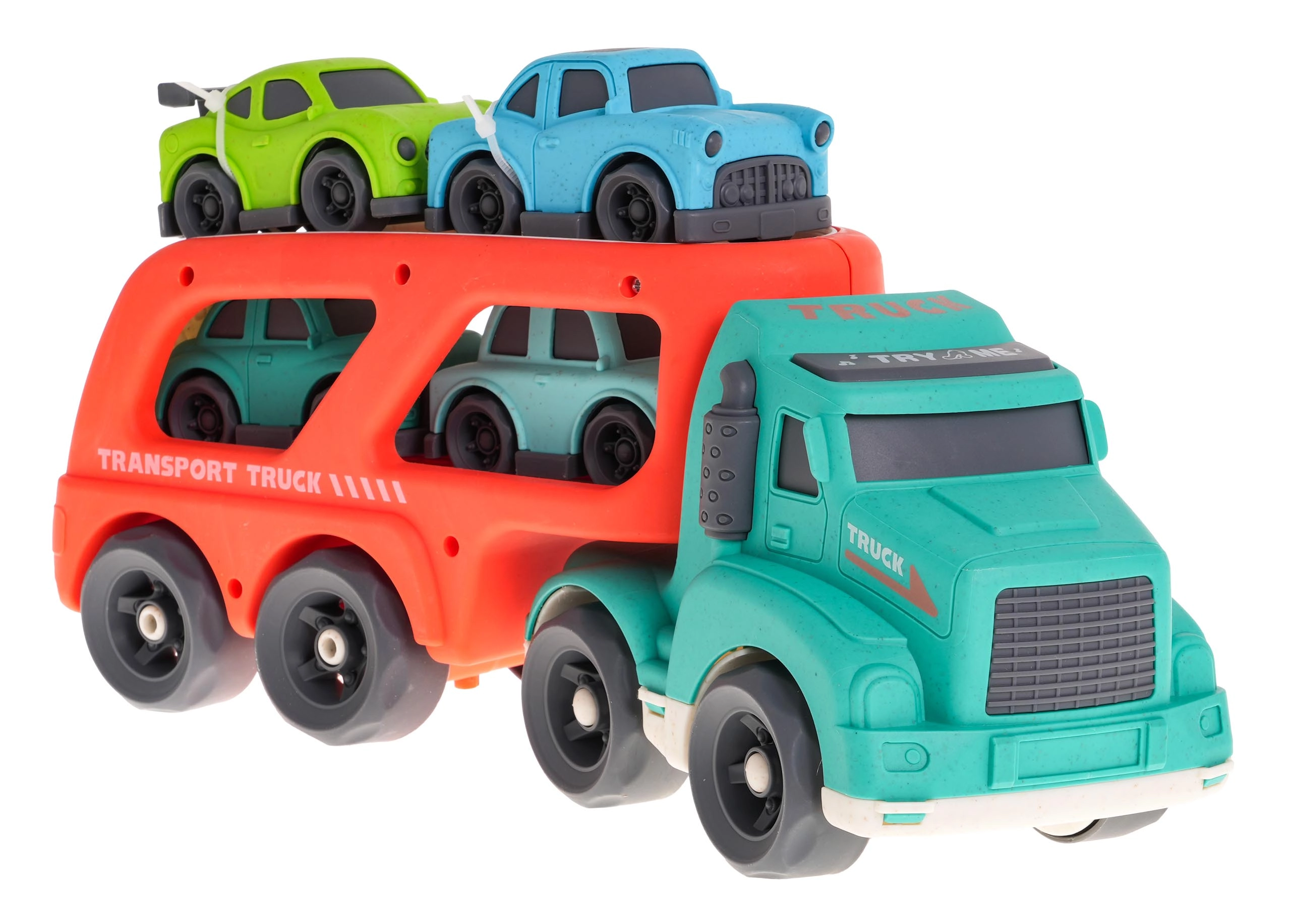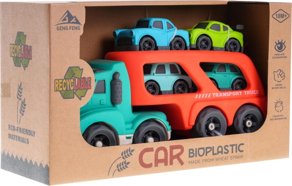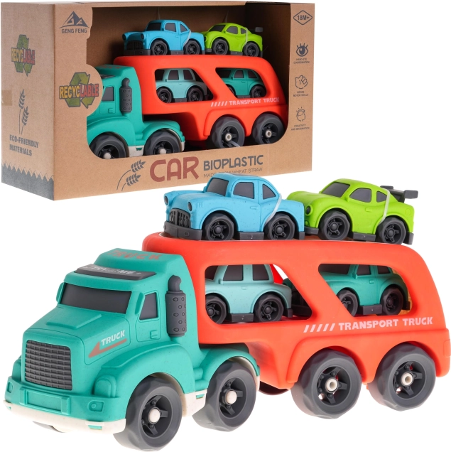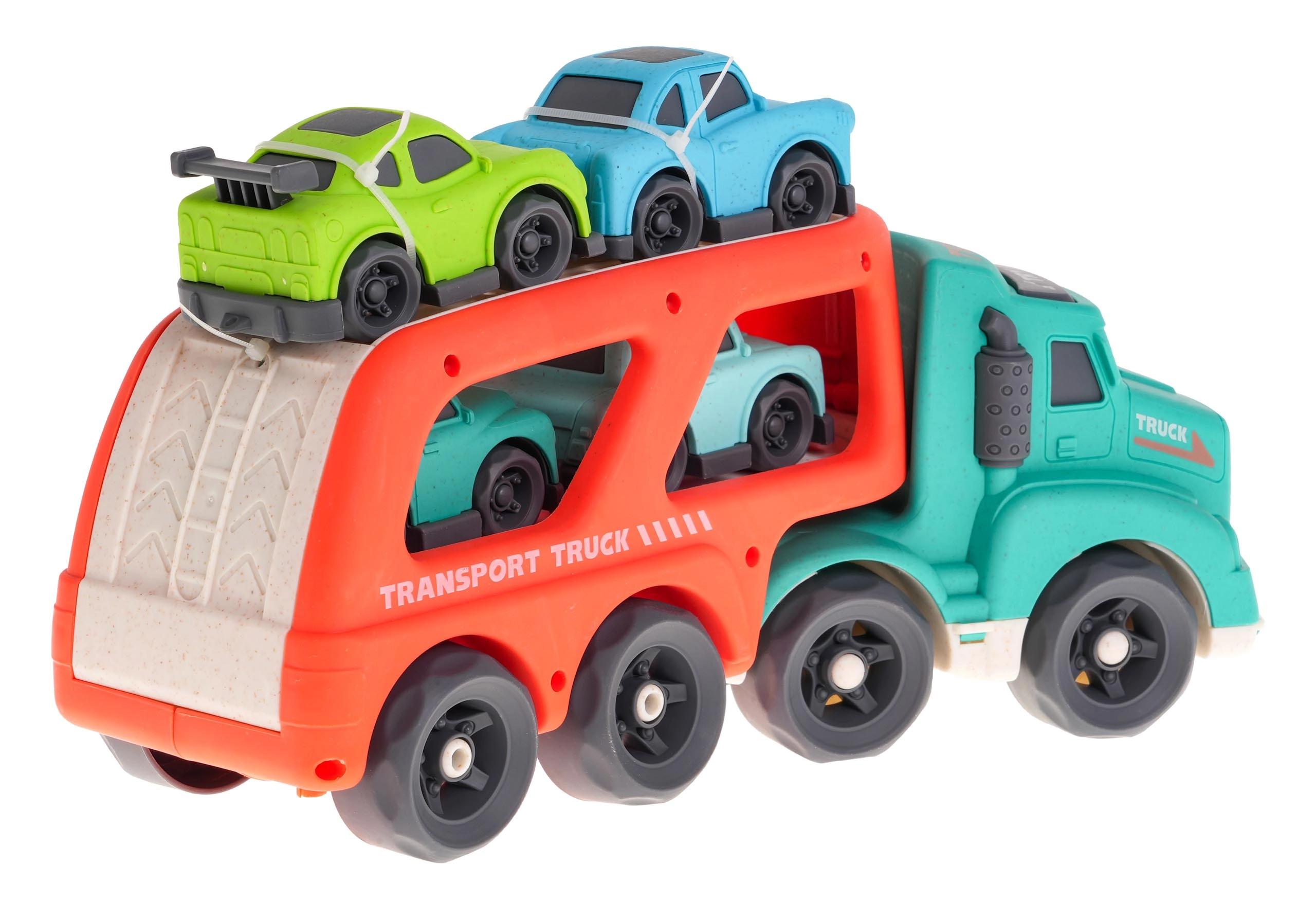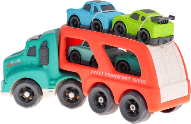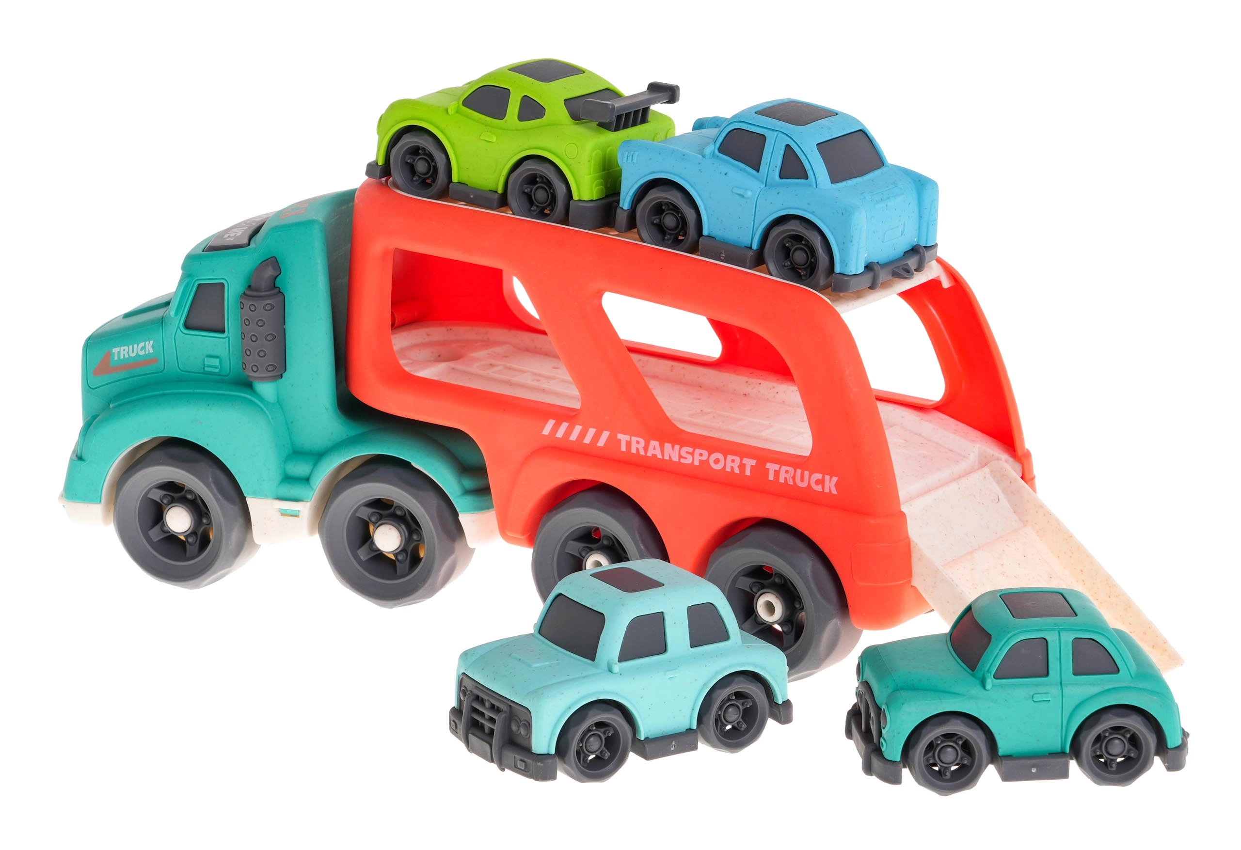Ce camion porte-voitures coloré avec plateau et 4 petites voitures stimule l’imagination et la motricité fine. Le plateau détachable, les roues qui roulent en douceur et les effets lumineux et sonores attrayants garantissent des heures de jeu. Le bioplastique préserve la nature tout en étant robuste et facile à entretenir.