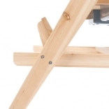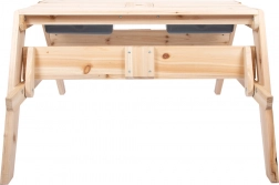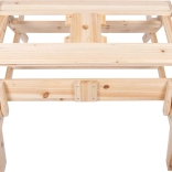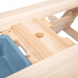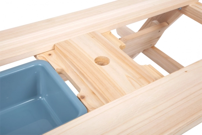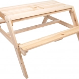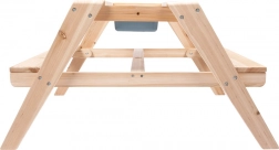 La table en bois sert de table de pique-nique et de surface de jeu avec bacs pour le sable ou l'eau.