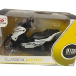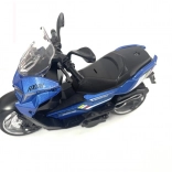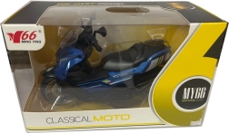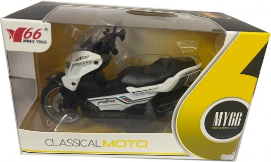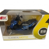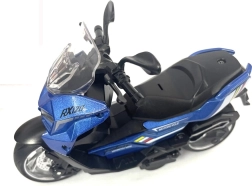 La moto présente des détails réalistes tels que la selle, le guidon et les roues, ce qui en fait une réplique miniature d’une machine réelle.