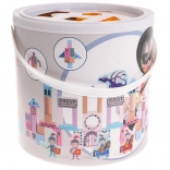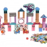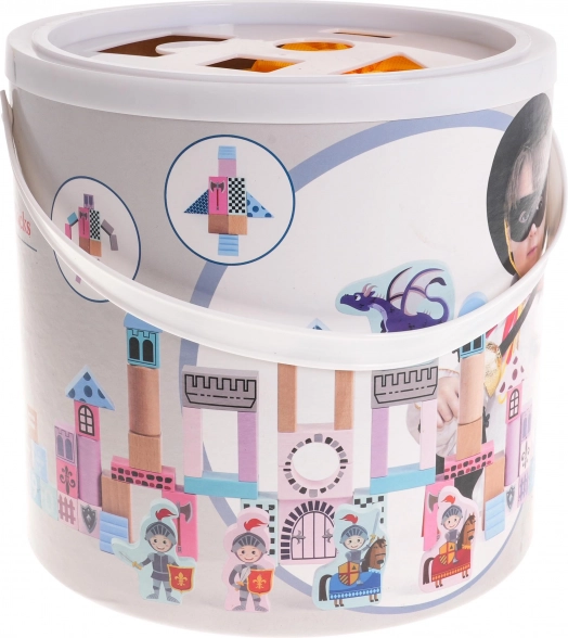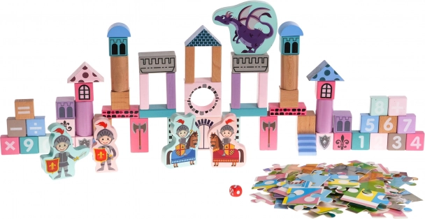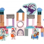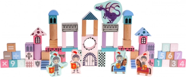 Le jeu de construction comprend des blocs peints pastel sécurisés qui permettent aux enfants de construire un château unique avec des chevaliers et des dragons.