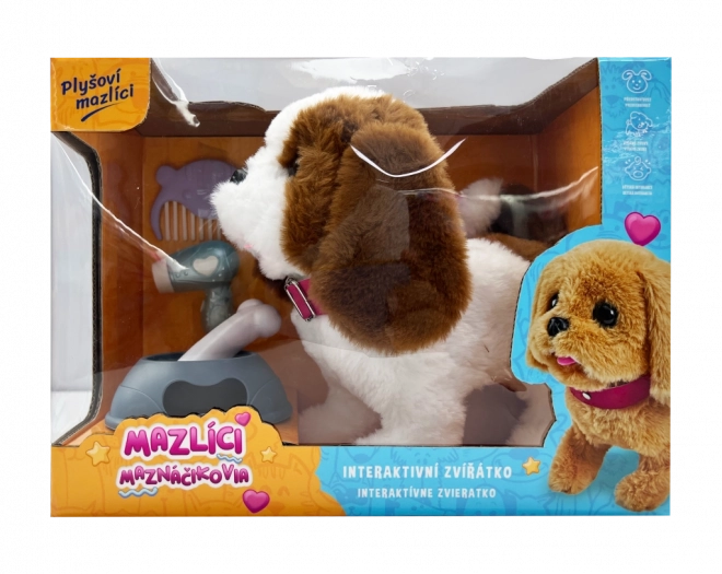 Le mignon chiot brun et blanc Patte de la série Mazlíci est un compagnon en peluche interactif qui divertit les enfants tout en les faisant apprendre. Il marche, émet des sons et remue la queue. L’emballage inclut un petit peigne, une gamelle et un os pour un jeu de soin qui développe l’imagination, l’empathie et la motricité fine.