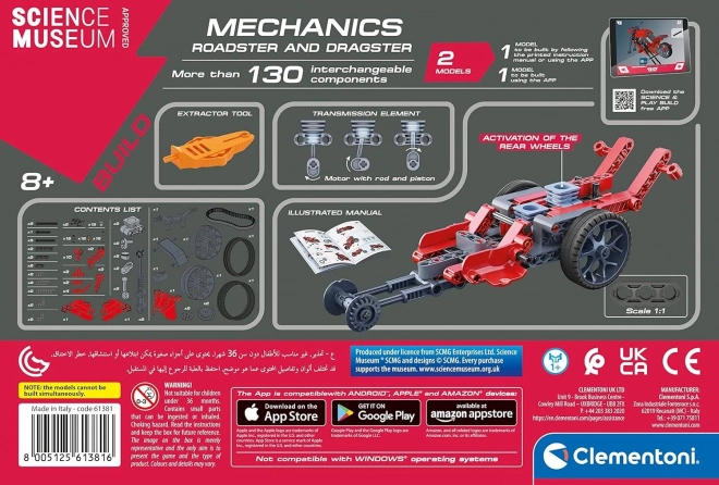 Ce kit de la gamme CLEMENTONI SCIENCE & PLAY initie les enfants au monde de la mécanique et de l’ingénierie. Construisez un roadster vif ou un dragster puissant et découvrez le fonctionnement des engrenages, bielles, pistons et modules d’engrenage. Grâce à l’assemblage précis des pièces, profitez d’une structure robuste et d’un mouvement fluide des modèles.