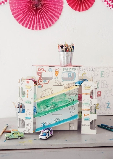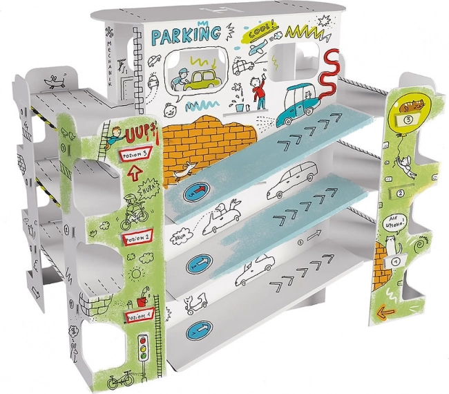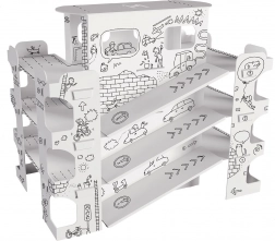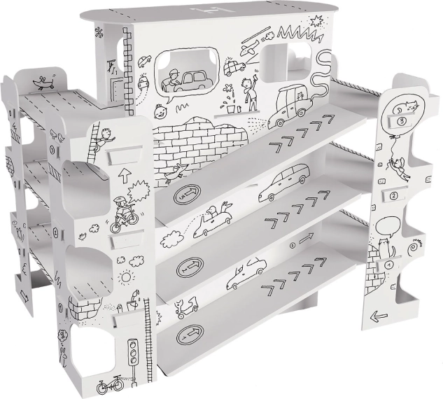 L’impression noire nette de qualité est idéale pour colorier avec des crayons, feutres, marqueurs et peintures. Le carton absorbe bien l’humidité, ne gondole pas et ne transperce pas. Les espaces ouverts, rampes et étagères invitent à la créativité, aux jeux de stationnement et stimulent l’imagination des enfants.