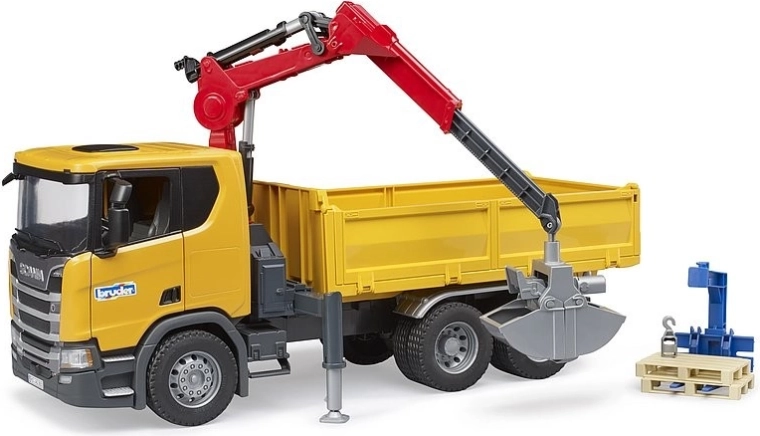 Pour transporter les matériaux facilement, le plateau basculant et les ridelles rabattables sont à votre disposition. L’emballage comprend des accessoires pratiques : deux palettes, fourches à palette et grappin avec godet, afin que les enfants puissent commencer immédiatement leurs missions de chantier.