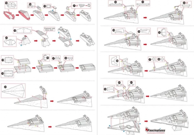 Retirez les pièces des plaques métalliques ; si nécessaire, utilisez de petites pinces coupantes (non incluses). Les pièces s’assemblent à l’aide de verrous formés par une languette et un trou. Pliez la languette avec de petites pinces fines (non incluses) et reliez progressivement tous les verrous jusqu’à obtenir une pièce maîtresse très réaliste !