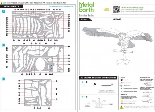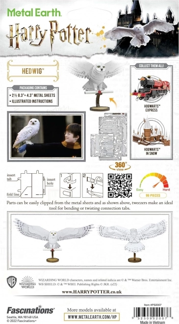 Profitez de l’assemblage précis du modèle métallique d’Hedwige, la fidèle chouette messagère de Harry Potter. À partir de fines plaques d’acier avec une gravure laser détaillée, vous créerez progressivement une réplique miniature réaliste aux ailes déployées, tenant une lettre dans ses serres. L’assemblage se fait sans colle : les différentes pièces se relient grâce à des verrous et des languettes pliées.