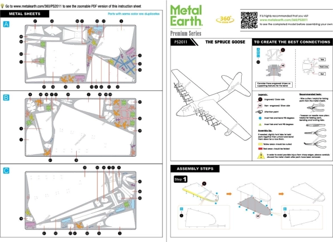 Le montage se fait sans colle – les pièces s’unissent via des verrous et des languettes pliées. Pour un assemblage confortable, nous recommandons des pinces fines et une petite pince coupante (non incluses). Une fois terminé, vous obtenez une maquette métallique stable à l’envergure impressionnante, qui met en valeur tout intérieur.