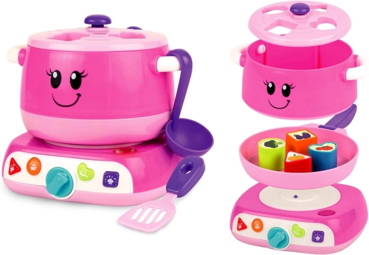 Les enfants adorent jouer à la maison et faire des jeux de rôle. La marmite sucrée enchantée parle polonais pendant le jeu. La marmite et son couvercle servent de trieur de formes. Le set comprend une marmite souriante, une petite poêle amovible, une spatule et une cuillère. Elle dispose d’éléments interactifs, de 4 boutons colorés et d’un commutateur rotatif. Une lumière signale la fin de la cuisson.