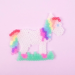 Procédure: Placez le modèle sous la plaque et assemblez les perles selon les couleurs. Après avoir fini, placez le papier de cuisson sur les perles et repassez l'image avec un fer à repasser chauffé à la température maximale jusqu'à ce que les perles fondent à moitié et fusionnent. Après refroidissement, retirez délicatement l'image de la plaque, que vous pouvez utiliser pour une nouvelle création. Attention: Lors de l'utilisation du fer, la supervision d'un adulte est recommandée.