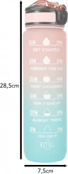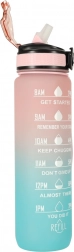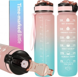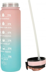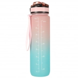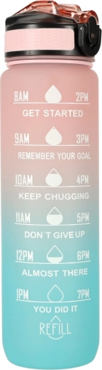 Gourde élégante de 1 L en Tritan avec dégradé rose–bleu, qui aide à maintenir une bonne hydratation grâce aux repères horaires motivationnels. Elle possède un couvercle rabattable avec verrou, une paille intégrée pour boire confortablement sans incliner la bouteille et est fabriquée dans un matériau léger, résistant et sans BPA.