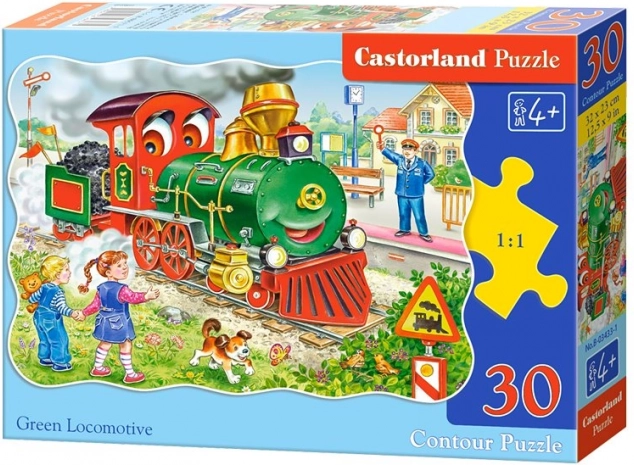 Puzzle coloré pour enfants avec un motif de locomotive verte, proposant 30 pièces et formant après assemblage une image de 32 × 23 cm. Idéal pour une première initiation, avec une fabrication de qualité et des couleurs attrayantes qui favorisent la concentration, la patience et le développement de l’imagination.